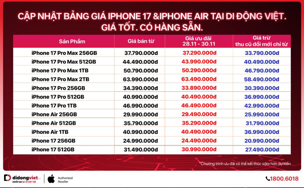 Bảng giá iPhone 17, iPhone Air mới nhất tại Di Động Việt.