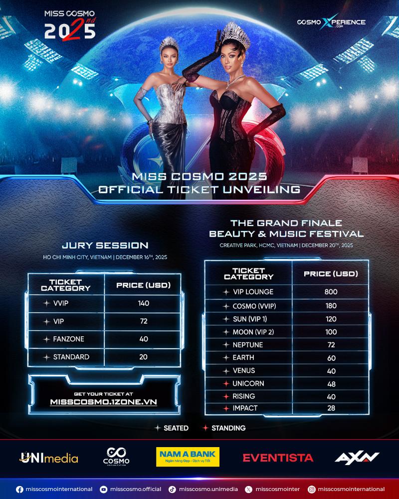 Mua vé ngay tại: https://misscosmo.1zone.vn VVIP: 3.500.000 VNĐ (~140 USD) VIP: 1.800.000 VNĐ (~72 USD) UNICORN (Fanzone): 1.000.000 VNĐ (~40 USD) IMPACT (Standard): 500.000 VNĐ (~20 USD) GIÁ VÉ ĐÊM CHUNG KẾT MISS COSMO 2025 SAU GIẢM VỚI MÃ “BONANG” Từ 20:00 ngày 1/11 đến hết ngày 3/11/2025 (giờ Việt Nam) Mua vé ngay tại: https://misscosmo.1zone.vn VIP LOUNGE BY NAM A BANK (S-VIP): 20.000.000 → 16.000.000 VNĐ (~640 USD) COSMO (VVIP): 4.500.000 → 3.600.000 VNĐ (~144 USD) SUN (VIP 1): 3.000.000 → 2.400.000 VNĐ (~96 USD) MOON (VIP 2): 2.500.000 → 2.000.000 VNĐ (~80 USD) NEPTUNE: 1.800.000 → 1.440.000 VNĐ (~58 USD) EARTH: 1.500.000 → 1.200.000 VNĐ (~48 USD) VENUS: 1.000.000 → 800.000 VNĐ (~32 USD) UNICORN (Fanzone): 1.200.000 → 960.000 VNĐ (~38 USD) RISING (Fanzone): 1.000.000 → 800.000 VNĐ (~32 USD) IMPACT (Fanzone): 700.000 → 560.000 VNĐ (~22 USD) |