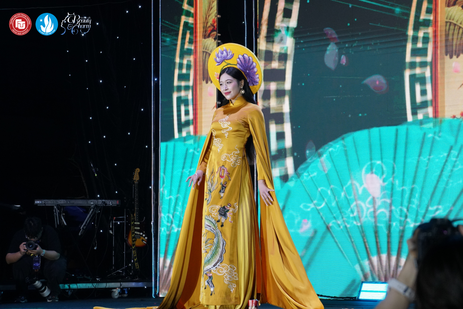 Mở đầu chương trình, phần thi Trình diễn Áo dài mang đến những khoảnh khắc lắng đọng, khi các thí sinh xuất hiện trong tà áo truyền thống với phong thái nền nã, duyên dáng. Mỗi bước đi trên sân khấu không chỉ tôn vinh vẻ đẹp hình thể mà còn gợi nhắc về chiều sâu văn hóa và bản sắc của người phụ nữ Việt Nam.