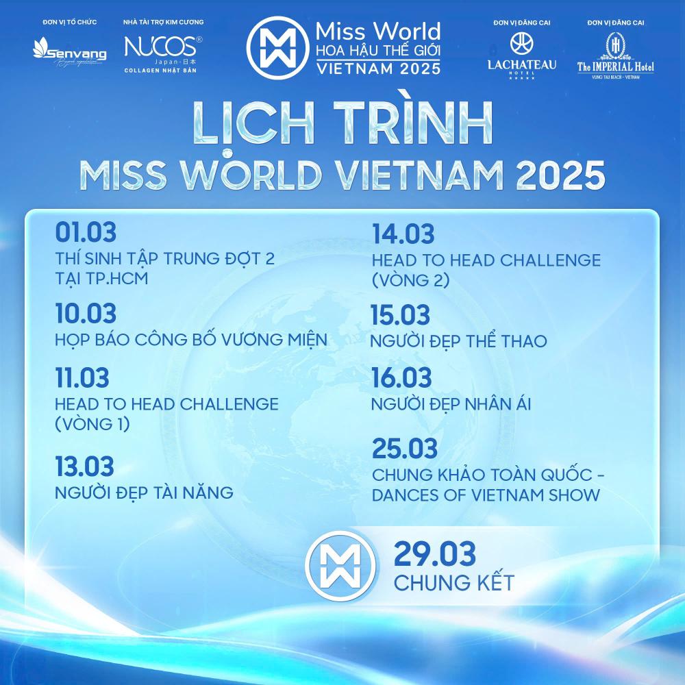 Tháng 3 này, Miss World Vietnam 2025 chính thức bước vào giai đoạn thứ hai trong hành trình tìm kiếm người kế nhiệm Hoa hậu Huỳnh Trần Ý Nhi và Á hậu Huỳnh Minh Kiên. Ban Tổ chức vừa công bố lịch trình cập nhật với một số điều chỉnh về thời gian tổ chức các hoạt động nhằm đảm bảo chất lượng chuyên môn và tạo điều kiện để thí sinh có sự chuẩn bị tốt nhất.