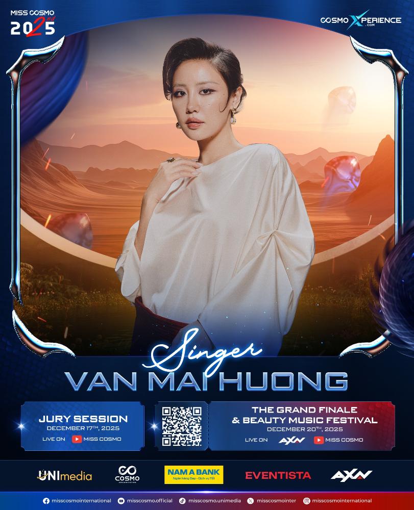 Văn Mai Hương sẽ xuất hiện với vai trò “Star Performer” tại Chung Kết Miss Cosmo 2025. Với hơn một thập kỷ hoạt động trong làng nhạc Việt, cô nổi bật nhờ kỹ thuật thanh nhạc điêu luyện, giọng hát giàu cảm xúc và khả năng kể chuyện qua âm nhạc.
