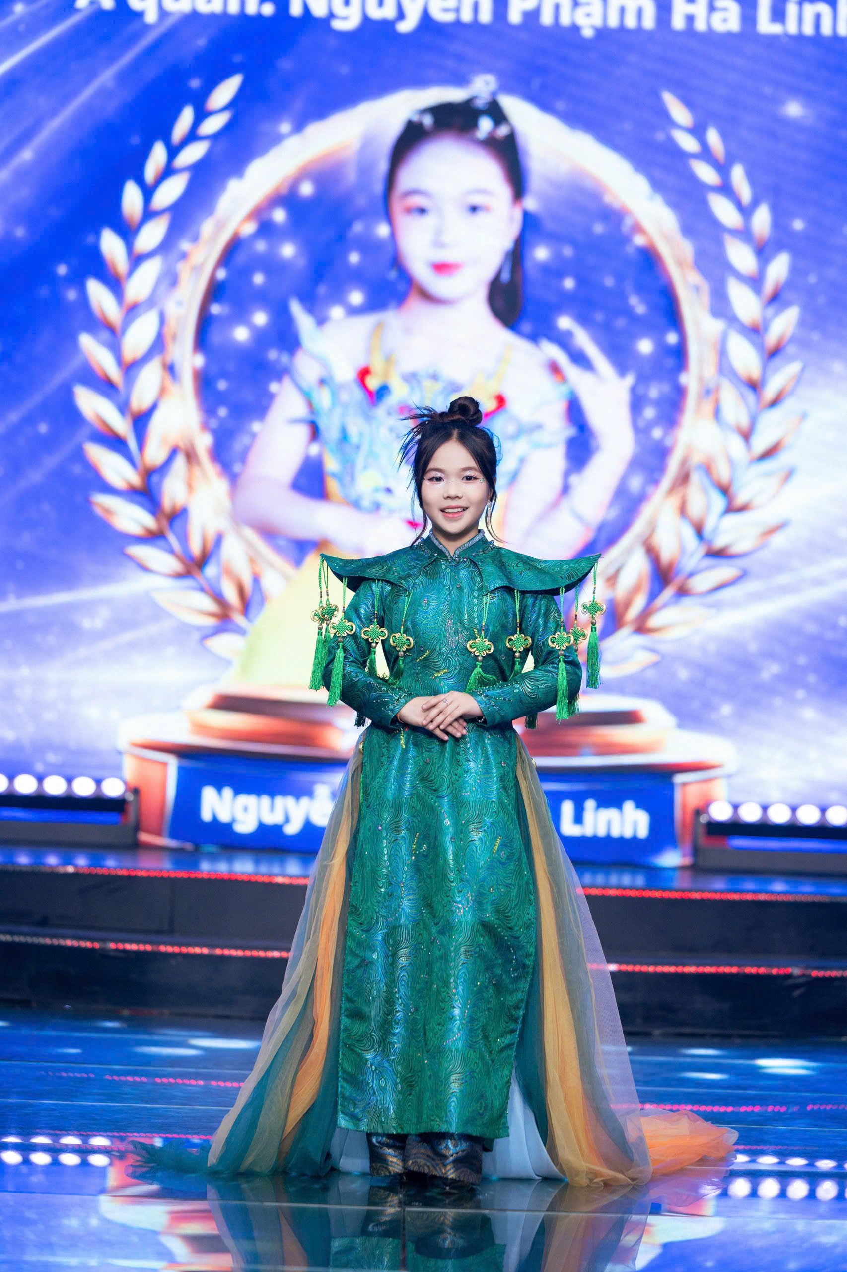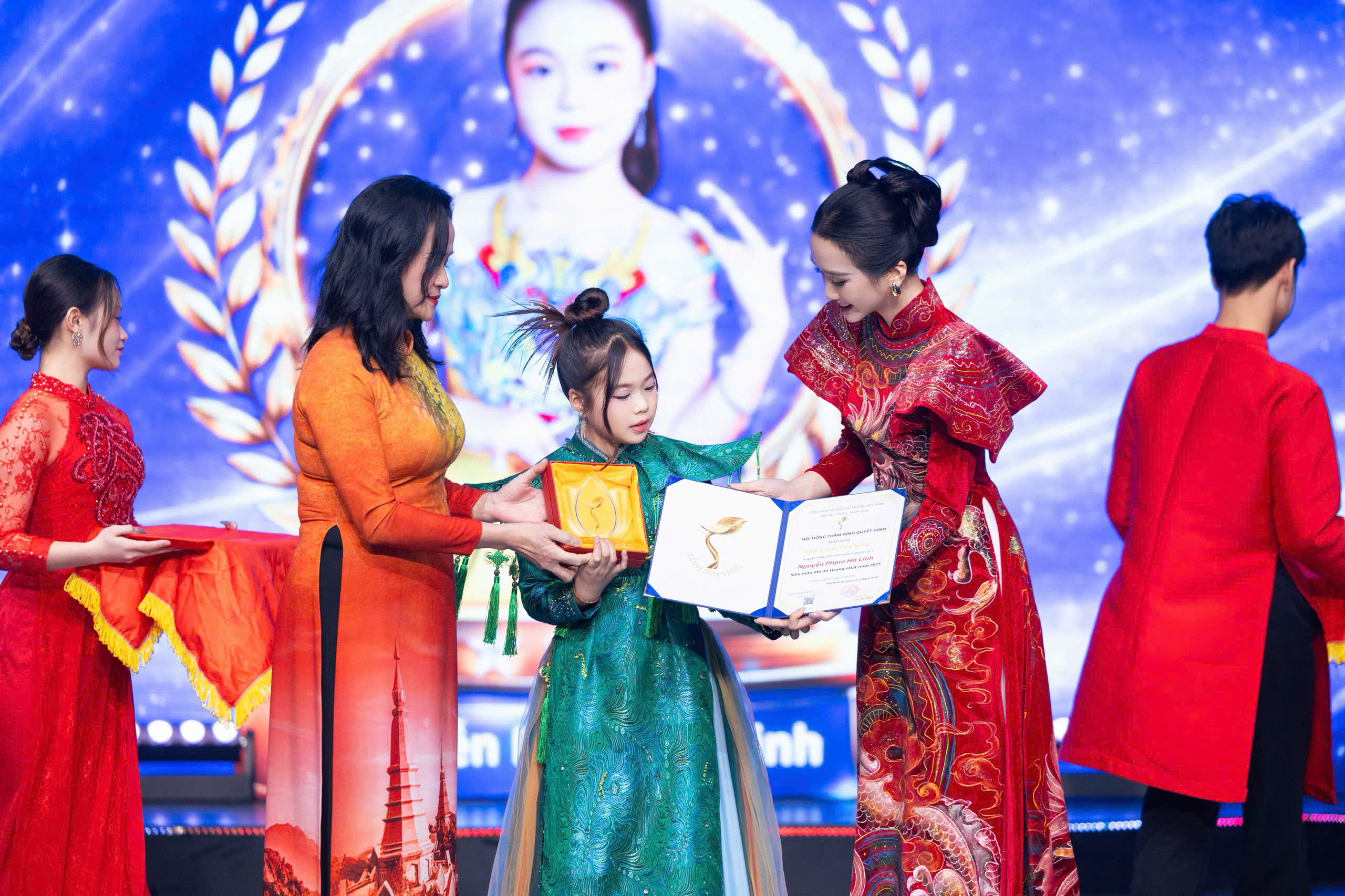 Xuất hiện trên sân khấu trong trang phục áo dài mang đậm nét di sản văn hóa, Hà Linh gây ấn tượng mạnh với quan khách bằng phong thái tự tin và lễ phép. Hình ảnh cô bé nâng cao chiếc cúp vàng cùng tấm bằng khen danh giá đã trở thành một trong những khoảnh khắc đẹp nhất của buổi lễ.
