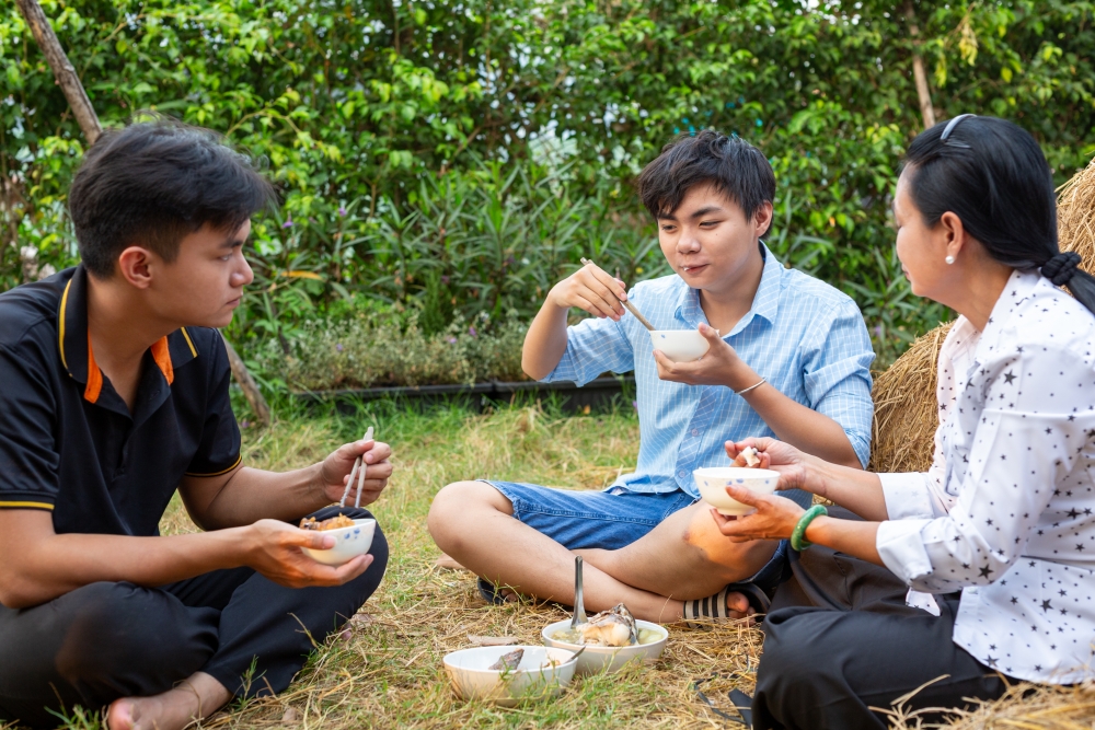 Gia đình bé Nếp và mẹ Nhi – những người hàng xóm nơi quê – mang đến hình ảnh đoàn tụ giản dị, để từ đó, cảm giác thiếu vắng của những người chưa thể sum họp càng hiện lên rõ ràng hơn.